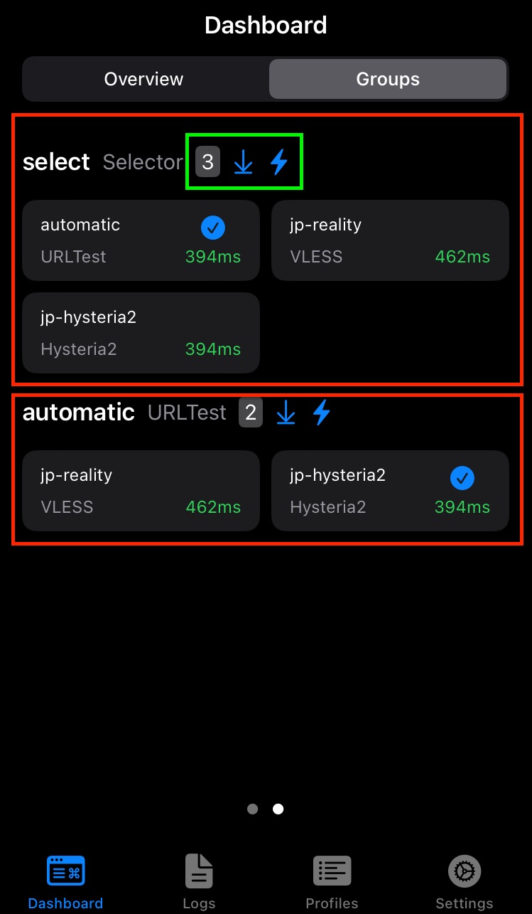 下面再费点口舌讲一下上图中正在使用的automatic这条线路,如果你的订阅里没有这种线路,可以跳过这段,以后遇到了再来看。严格来说它不是一条线路,它是一组线路。这组线路都有哪些具体的线路呢? 下面那个红色框的线路才是它具体的线路。注意看automatic旁边的"URLTest",它不像上图绿框旁边那是个"Selector",所以它的类型和工作逻辑跟上面红框里直接的线路选择不一样。当你指定使用这条名字叫automatic的线路时, 它会在这组线路里寻找最快的那条并指定它来使用,保证你用的是最快的线路,而且每过一个特定的时间它会对组内所有线路测速一次并切换到最快的那条线路。但是这个功能由提供订阅的人来决定,用户决定不了, 甚至不一定叫automatic,这都由提供订阅的人来决定。