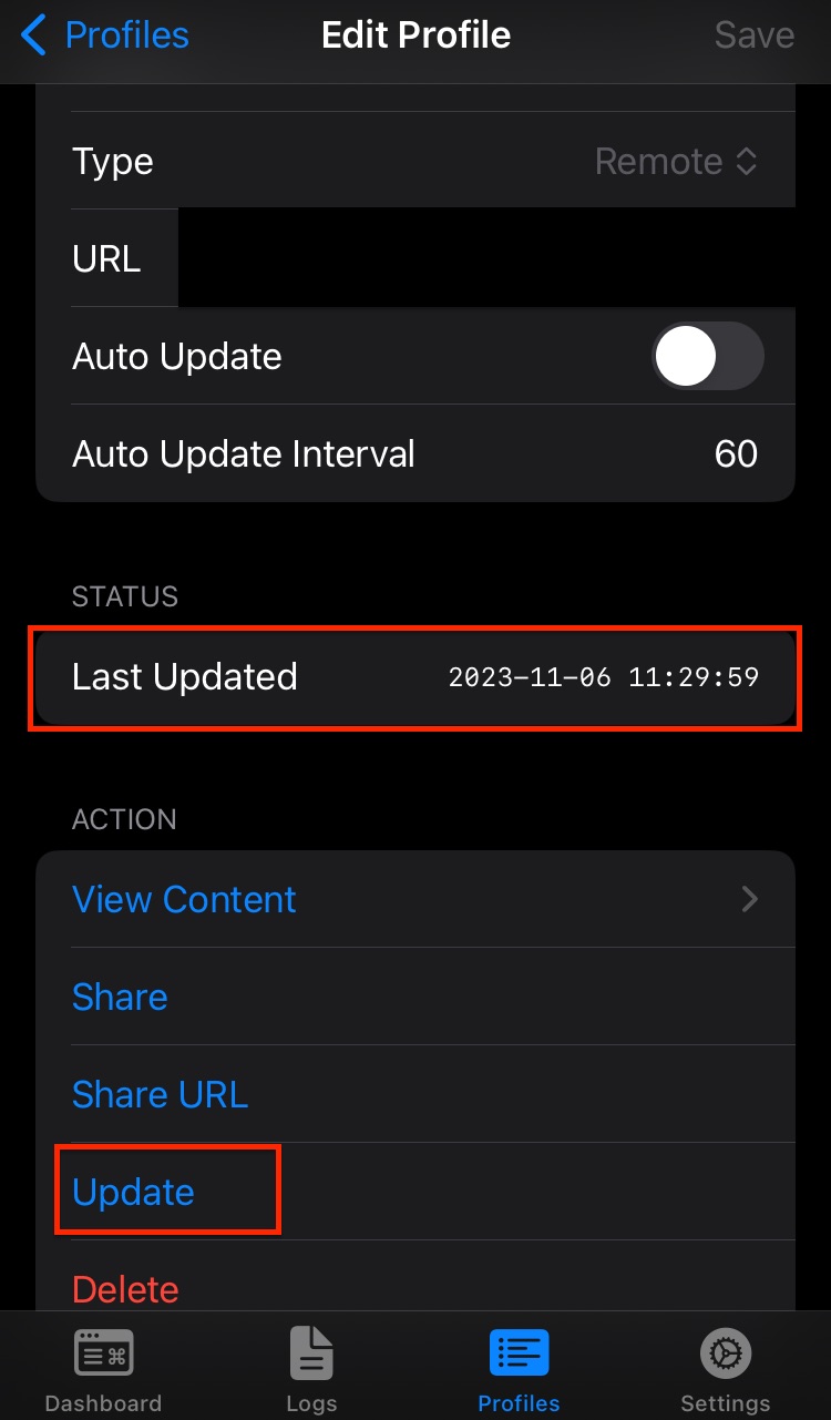 如果你根据我的建议关闭了自动更新订阅,那么当线路发生改变时你需要手动进行更新订阅。点击底部的"Profiles",然后点击你想要手动更新订阅的名字,则会进入下图: